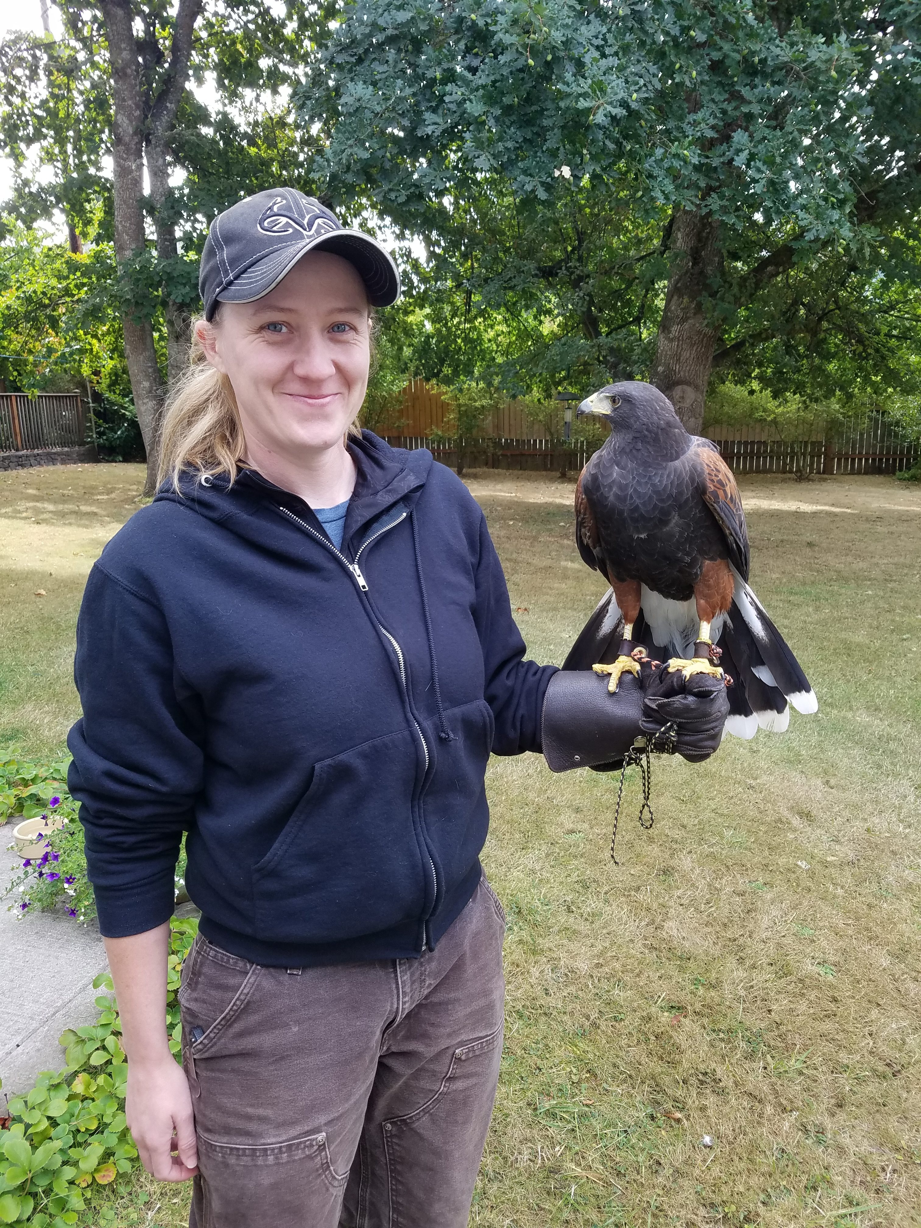 In order to become an apprentice falconer, I had to find a sponsor. A sponsor helps you to learn the ins and outs of falconry, and is your main support person during the two or more years of apprenticeship. I contacted the Oregon Department of Fish and Wildlife to see if there were any falconers in my area who were willing to be my sponsor. ODFW put me in contact with Kris Ebbe, a long-time raptor rehabilitation specialist turned falconer. Kris agreed to be my sponsor, and helped me to get exposure to handling raptors with her two Harris Hawks, Tauriel and Kili. She took me hunting several times before I even applied for my license so I could see what hunting with hawks was all about. I was hooked.