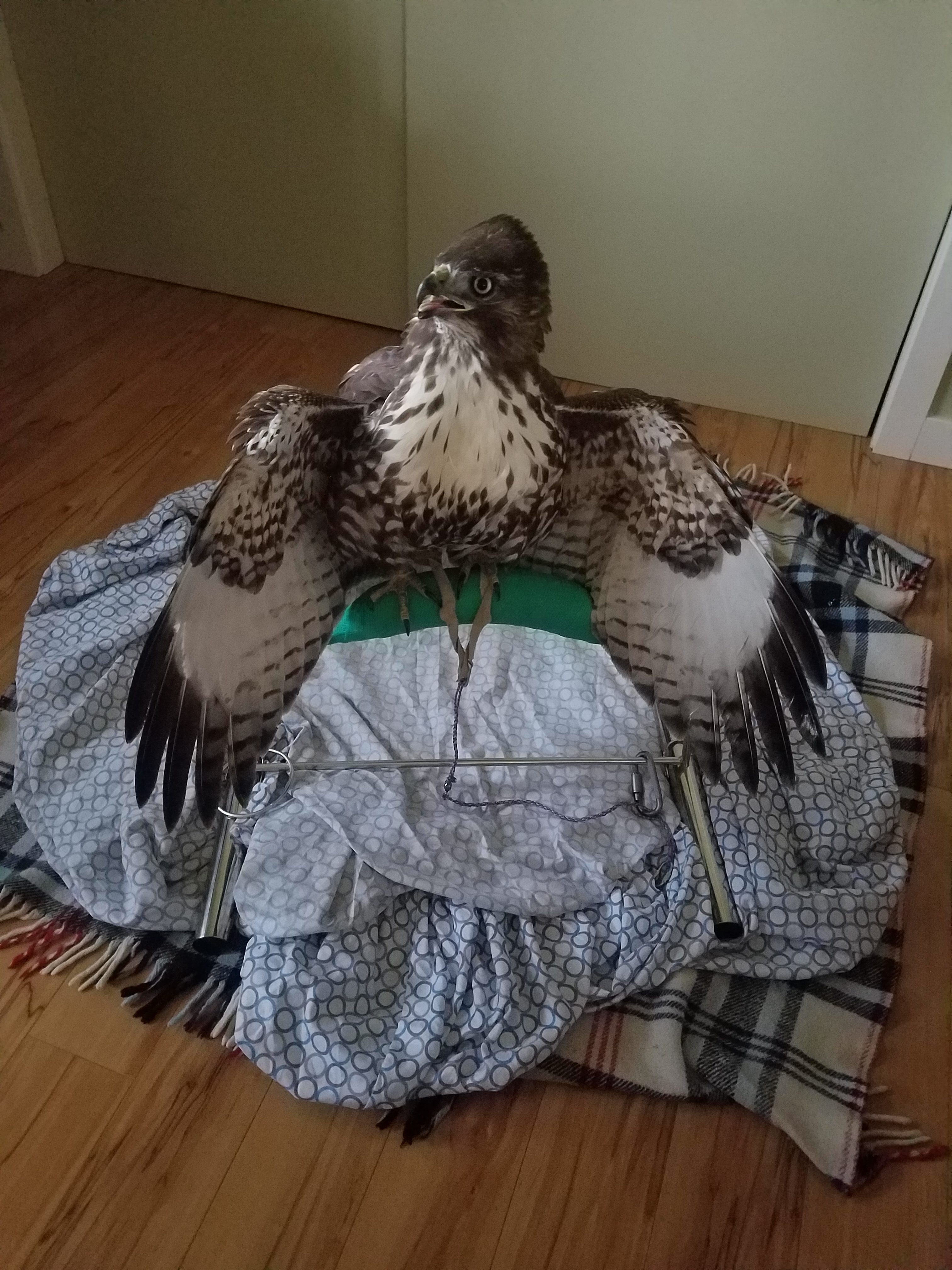 I couldn’t sleep that night. I woke up early and went to the office where Alder was in a crate for the night. I carefully opened the crate and extracted the giant ball of angry frightened feathers, and held her. Her wings were out and she would not take her eyes off of me. It was hours straight of that intense stare. I set up her bow perch to give my arm a rest. She sat on it with her wings out and continued to look at me.